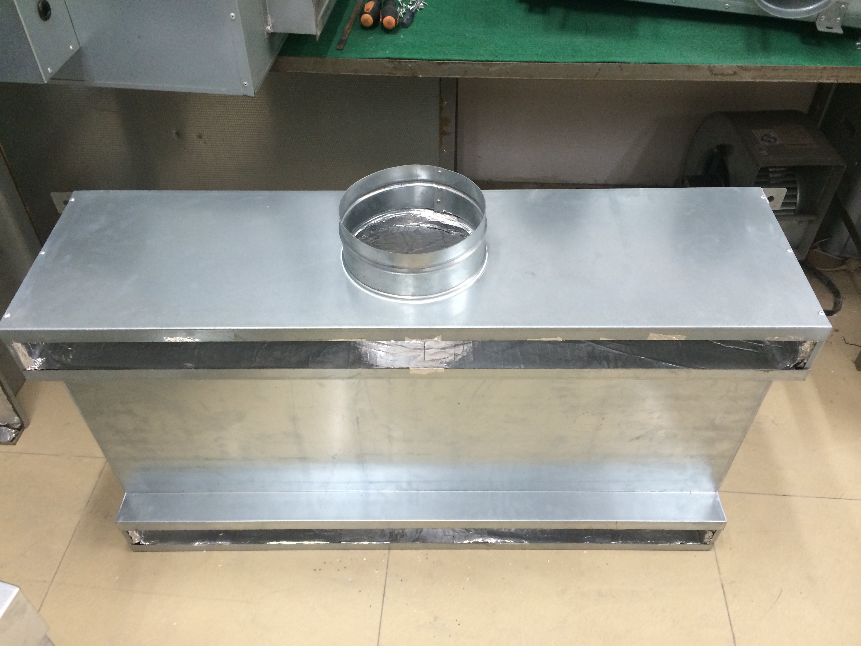 2、风口连接箱采用厚度不低于1.0mm钢板制作,内外表面喷塑处理, 用作送风的每边需有不小于25mm 的条縫。进风口设置与软管连接的短管,短管做卡槽与软管采用卡箍连接,内置手动风量调节装置。